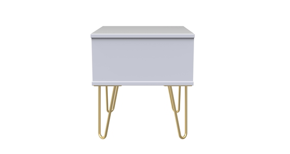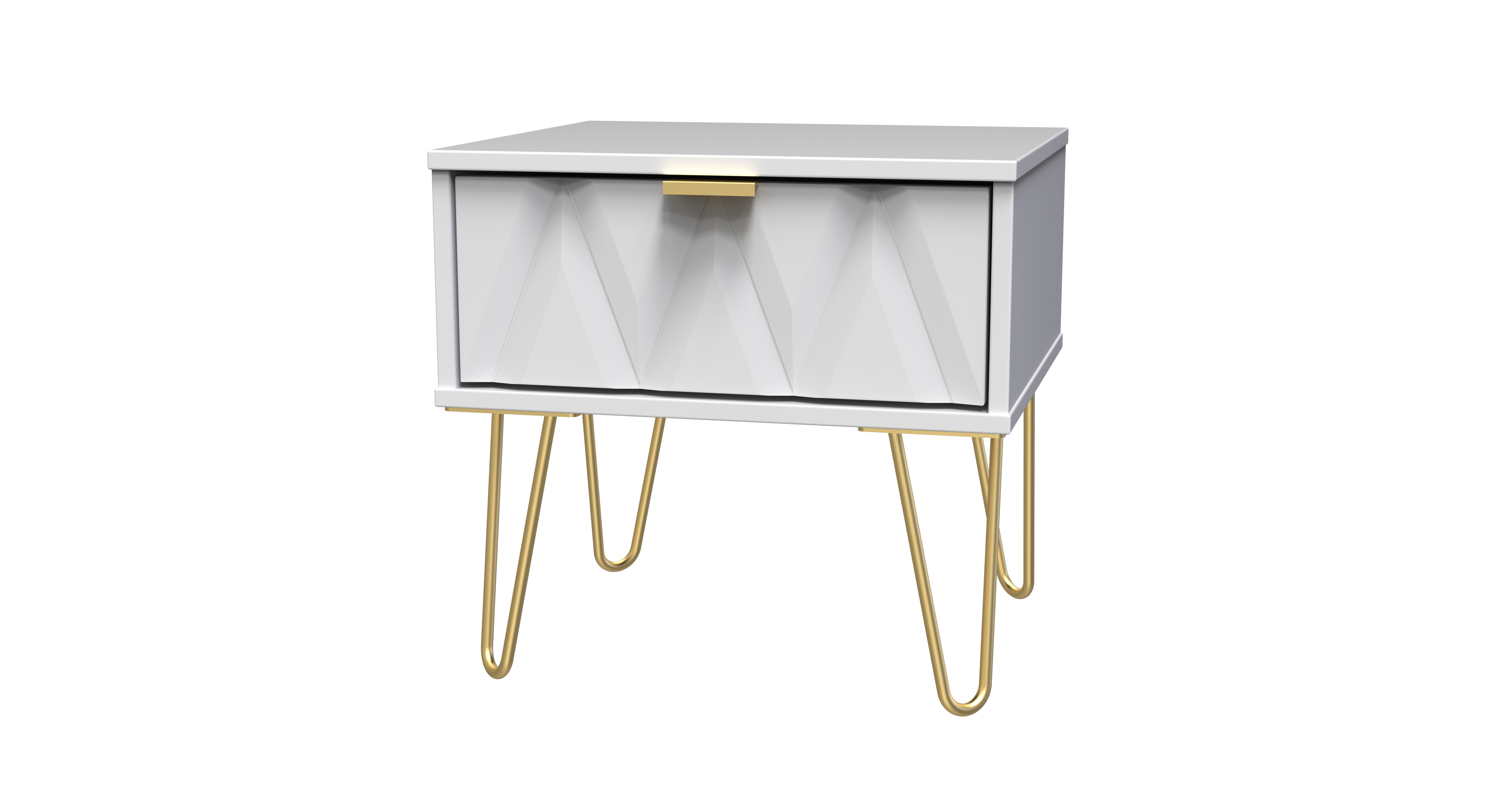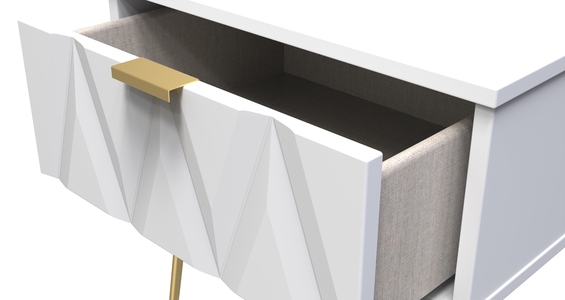 This single drawer low level bedside cabinet is practical and stylish. Perfect for any bedside or as a free standing storage unit. Say hello to contemporary cool with the Diamond range, with distinctive patterned drawers and a variety of colour options available to compliment any interior design. Gold metal handles and sturdy hairpin legs complete the storage solution. All our furniture is made in the United Kingdom, to the highest quality. It is delivered direct to your location of choice by one of our two man delivery teams, and comes fully assembled (although legs may be removed to prevent damage in transit).