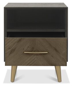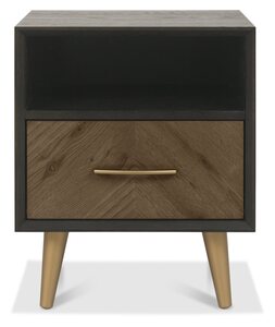 Fusing mid-century and contemporary styling, the Sienna bedroom range features chevron patterned rustic oak veneer headboards, drawer fronts and doors, in a stunning fumed oak finish. Wire-brushed oak veneers frame each piece in a dark peppercorn stain that is also reflected in the colour of the cabinet interiors and bedstead. Contrasting satin brass handles and conical-shaped legs add a glamorous touch to the collection, which is further accentuated with design choices like the mitred and bevelled frames, and soft-close drawer runners.