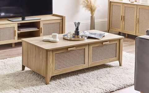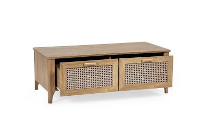 Showcasing a beautifully sleek design with a bohemian feel, the Sydney 2 Drawer Coffee Table offers exquisitely curved edging accompanied by a raised lip around the edge providing a practical addition, stunningly combined with a rattan effect front. Finished with a natural oak effect featuring two pull-out drawers to store away items discretely. All around creating the perfect airy, warm feel within your home.