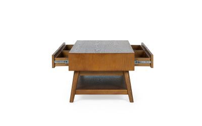 A gorgeous retro-inspired style, the Lowry Coffee Table is constructed from an exquisite cherry ash wood veneer with beautifully tapered legs. Featuring 2 drawers and an efficient shelf for storage. Complemented by gold framed knobs, providing the perfect staple to create an effortless look in any occasional space.
