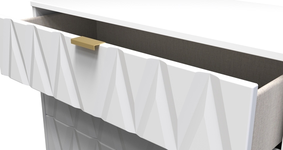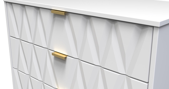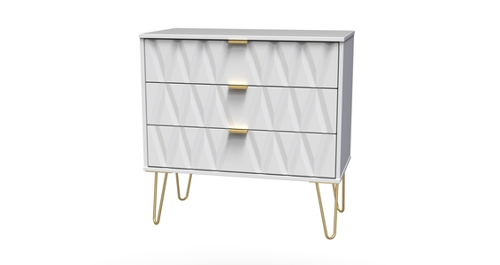 This wide 3 drawer chest of drawers is practical and stylish. Perfect for any home as a free standing storage unit. Say hello to contemporary cool with the Diamond range, with distinctive patterned drawers and a variety of colour options available to compliment any interior design. Gold metal handles and sturdy hairpin legs complete the storage solution. All our furniture is made in the United Kingdom, to the highest quality. It is delivered direct to your location of choice by one of our two man delivery teams, and comes fully assembled (although legs may be removed to prevent damage in transit).