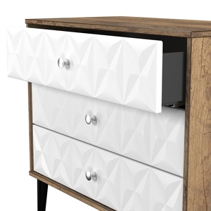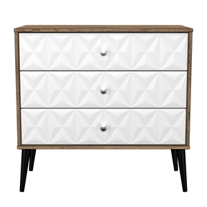 This wide 3 drawer chest of drawers is practical and stylish. Perfect for any home as a free standing storage unit. A modern and distinctive range. Named for the unique "Pixel" patten of the drawer and door fronts. Also features Black Metal Handles and Black Hairpin Legs. Comes in a wide range of colours including eye cathching two tone colour combinations. All our furniture is made in the United Kingdom, to the highest quality. It is delivered direct to your location of choice by one of our two man delivery teams, and comes fully assembled (although legs may be removed to prevent damage in transit).