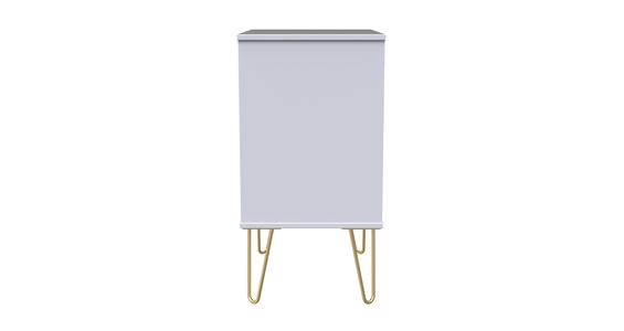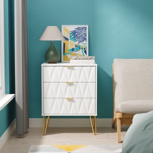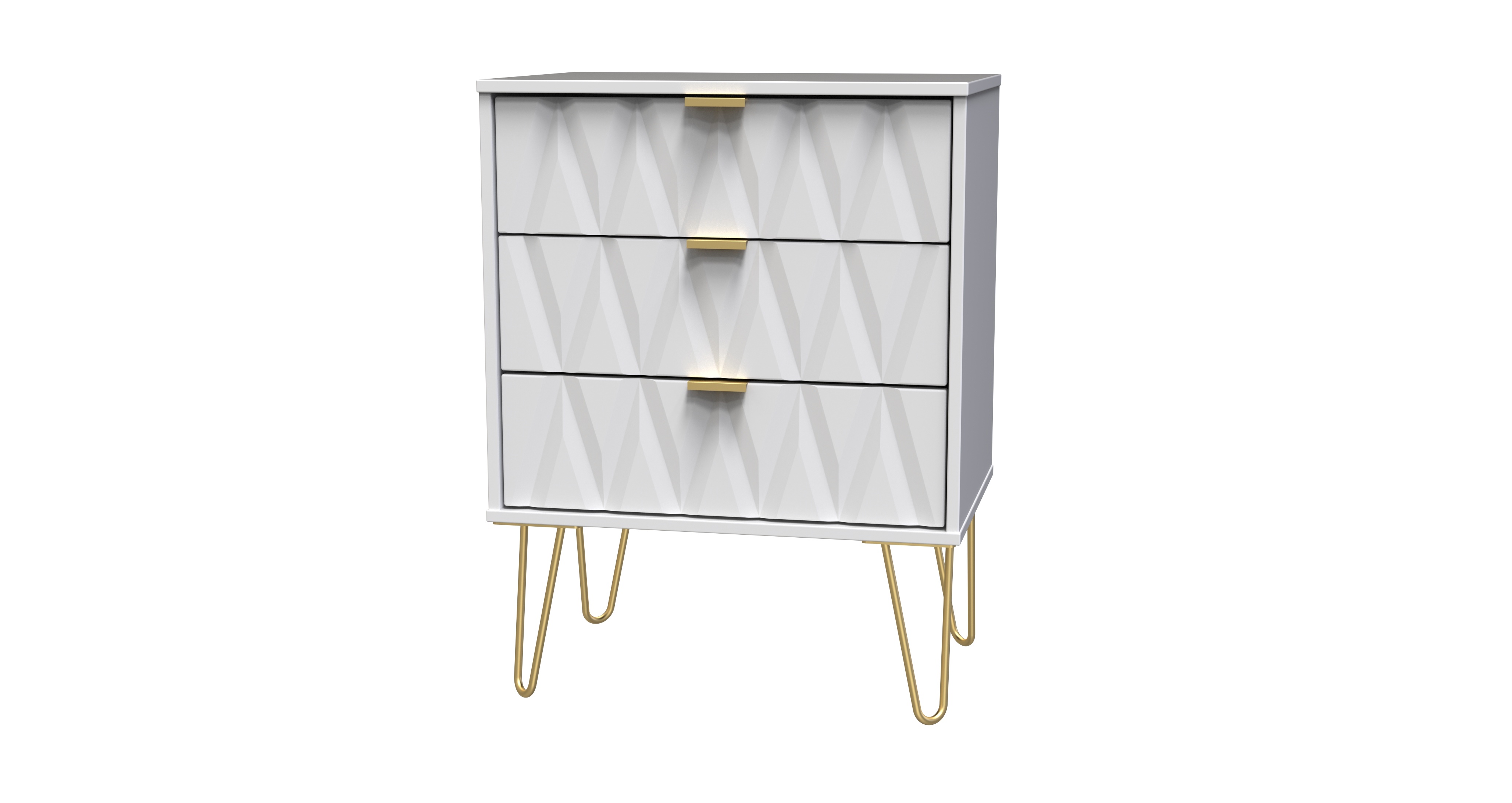 This 3 drawer bedside cabinet is wider than normal for added practicality. Perfect for any bedside or as a free standing storage unit. Say hello to contemporary cool with the Diamond range, with distinctive patterned drawers and a variety of colour options available to compliment any interior design. Gold metal handles and sturdy hairpin legs complete the storage solution. All our furniture is made in the United Kingdom, to the highest quality. It is delivered direct to your location of choice by one of our two man delivery teams, and comes fully assembled (although legs may be removed to prevent damage in transit).