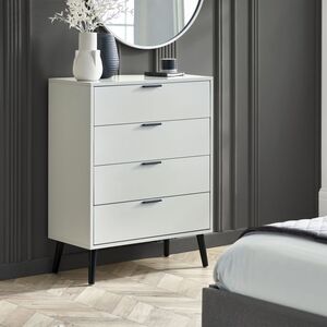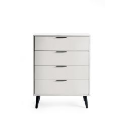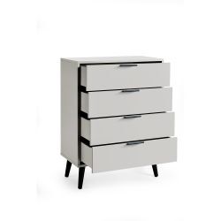 Introducing the Alba 4 Drawer Chest in Silk Grey, a sophisticated piece that combines functionality with modern flair. Its elegant silk grey finish brings a soft, refined touch to your bedroom, effortlessly complementing any decor style. Featuring four generously sized drawers, it provides ample storage for your essentials, helping to keep your space tidy and organised. The smooth-gliding drawers, paired with black tapered legs and matching black handles, enhance its contemporary design, adding a subtle contrast.