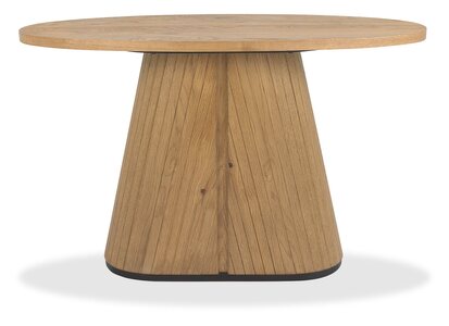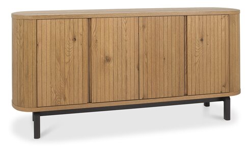 Blending rustic character with contemporary design, the Vega Rustic Oak range adds warmth and personality to the dining experience. Elliptical dining table tops, surfaced with hardwearing sawcut oak and finished in a nourishing oil finish, feature sturdy pedestal bases with tapered silhouettes and v-groove detailing, offering both durability and visual appeal. The range extends to versatile pedestal based occasional pieces, including an oval lamp and coffee table. Additionally, further choice is offered with drum style occasional designs with discreet storage behind hinged doors. Cabinetry with soft curved ends sit on contrasting peppercorn bases with refined scalloped legs. Concealed drawers in the sideboards provide practical storage, while moulded ply-back chairs and barstools, upholstered in ivory bonded leather or fine-weave grey fabric, deliver comfort with modern elegance.