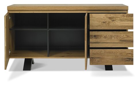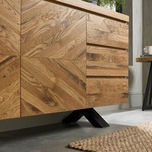 The striking saw cut rustic oak marquetry tops on the thick table tops and cabinet doors contrast beautifully against the large welded peppercorn powder coated metal bases, creating a range that successfully blends intricate craftsmanship and indulgently warm tones with an on trend industrial aesthetic.