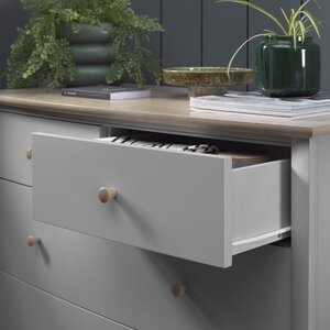 A timeless Scandinavian inspired bedroom range with clean lines and radiused frames, Whitby boasts a striking contrast of fresh and contemporary pale finish on oak with a mid-tone grey pigment. Design features include beautiful tapering spindles set within the arched top rail of the headboard with soft, elliptical shaped frames on the cabinet encasing gently bowed drawers with groove detailing which are finally completed with delicate turned handles. Whitby draws from past inspiration to offer a calm and casual aesthetic to any bedroom.