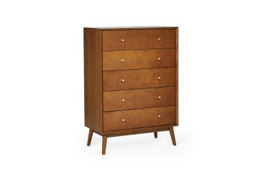 A retro-inspired style with a nostalgic feel, the Lowry Bedroom collection is a gorgeous timeless design that will add character and depth to any bedroom space. Constructed from an exquisite cherry ash wood veneer with beautifully tapered legs, complemented by gold framed knobs. The Lowry 5-drawer chest features 5 drawers providing great storage for clothing and essentials.