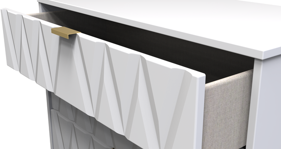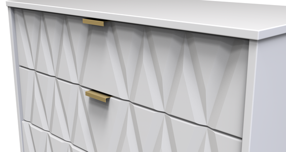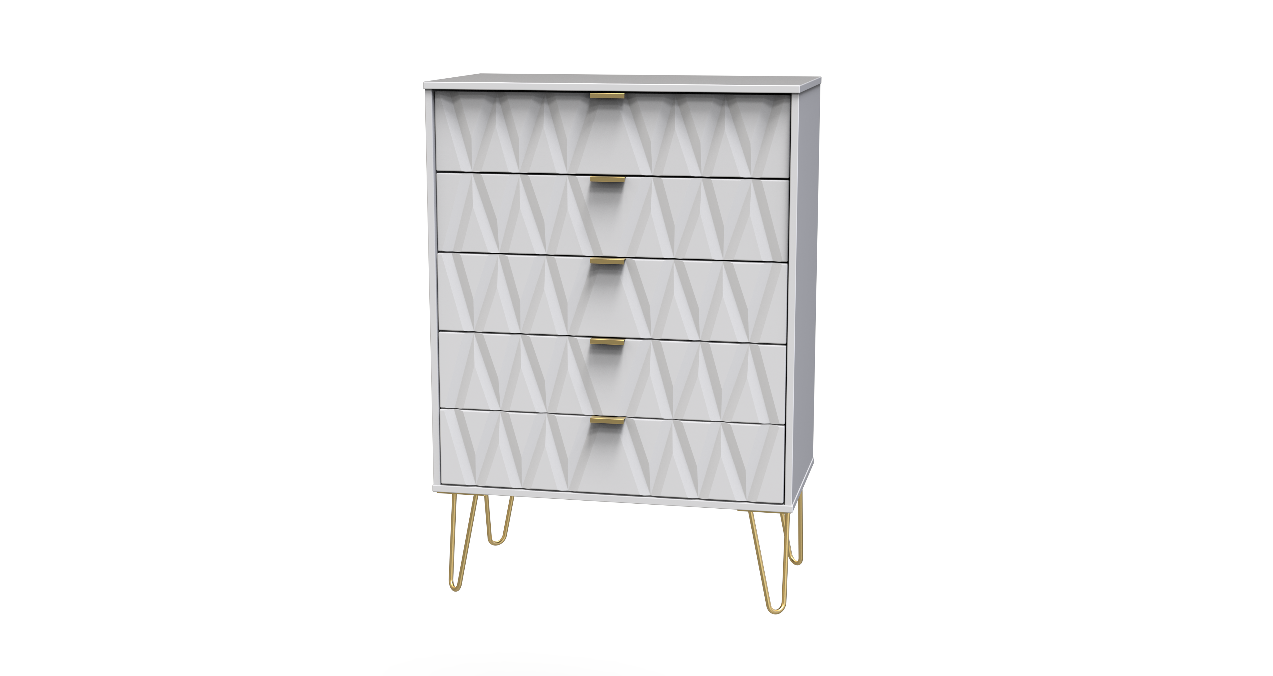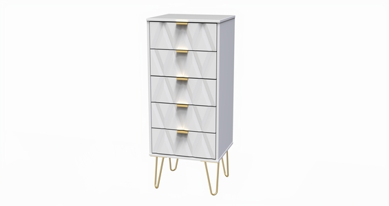 This wide 5 drawer chest of drawers is practical and stylish. Perfect for any home as a free standing storage unit. Say hello to contemporary cool with the Diamond range, with distinctive patterned drawers and a variety of colour options available to compliment any interior design. Gold metal handles and sturdy hairpin legs complete the storage solution. All our furniture is made in the United Kingdom, to the highest quality. It is delivered direct to your location of choice by one of our two man delivery teams, and comes fully assembled (although legs may be removed to prevent damage in transit).