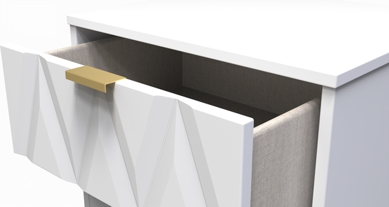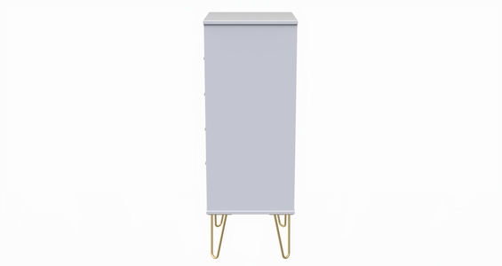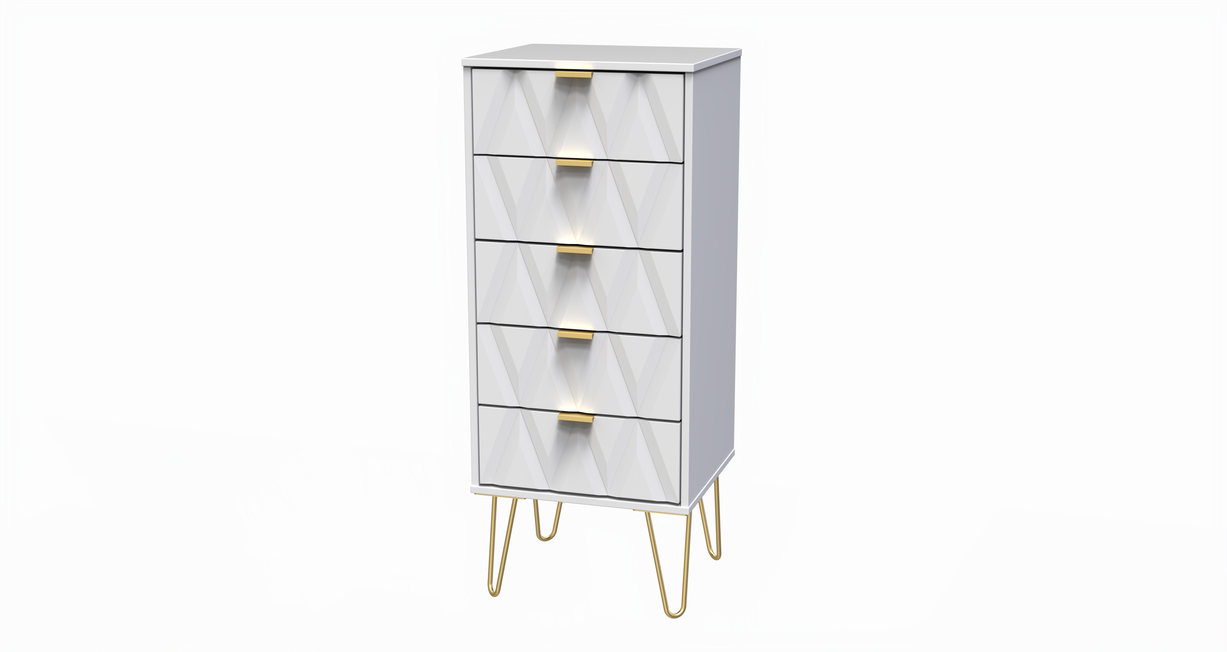 This 5 drawer chest of drawers is practical and stylish. Perfect for any home as a free standing storage unit. Say hello to contemporary cool with the Diamond range, with distinctive patterned drawers and a variety of colour options available to compliment any interior design. Gold metal handles and sturdy hairpin legs complete the storage solution. All our furniture is made in the United Kingdom, to the highest quality. It is delivered direct to your location of choice by one of our two man delivery teams, and comes fully assembled (although legs may be removed to prevent damage in transit).