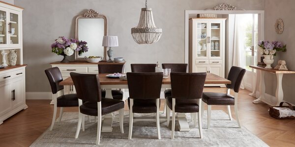 Belgrave is a classically styled design contrasting an ivory painted finish with beautifully hand-crafted marquetry tops using American white oak solid timbers and veneers. Each piece of furniture reflects the intensified natural characteristics of rustic oak wood such as knots, mineral streaks pinholes, sapwood, handplaning, saw marks and wood colour variation. These natural variations in colour, grain and random positioning of knots are inherent characteristics and add to the attraction of the wood, resulting in an individuality that is unmatched by regular furniture. The range is completed with bold bespoke handles in a rich antique brass finish and a choice of generous upholstered chairs in a choice of tan and espresso antique faux leathers. BLUM soft closing drawers add that extra refinement to what is a timeless classic.