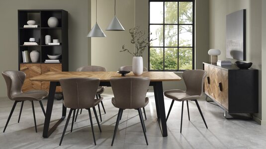 With a modernised retro look, Emerson features striking patterns of saw cut rustic oak tops & facias that are showcased against wire brushed peppercorn finished frames and a welded black powder coated metal base. Each of the hand-crafted pattern tops are wire brushed and distressed to give a rustic look and tactile feel, making the most of the beautiful and varied grain. Soft form barrel shaped table tops and moulded curved seats and back on the chairs pair contemporary craftmanship with utmost comfort, with the choice of rich velvets and mottled aged fabrics making a statement in any home. Shaped metal handles that mirror the geometric oak patterns and hidden soft close drawers in the sideboards complete this luxuriously sophisticated and dynamic range.