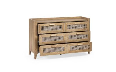 A beautifully sleek design with a bohemian feel, the Sydney 6 Drawer Wide Chest offers exquisitely curved edging accompanied by a raised lip around the edge providing a practical addition, stunningly combined with a rattan-styled front. Finished with a natural oak effect featuring six wide drawers providing the ideal storage space for any bedding or clothing items plus extra space on top for ornaments to be placed. Creating the perfect airy, warm feel within your home.