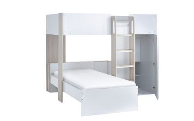 Enter the enchanting world of the Horizon Bunk in a pale woodgrain and white finish, a versatile and delightful sleeping solution crafted especially for your little ones. Beyond offering a good night's sleep, this bunk bed is an adventure waiting to unfold! What truly sets it apart is its innovative design, allowing the bed below to easily transform into alternate positions, adapting to the evolving needs of your little adventurer. The built-in wardrobe and shelving surrounding the inside of the lower bunk offer ample space for storage and display, encouraging organisation and creativity. Bedtime transforms into a joyful adventure with their favorite toys, books, and treasures always within arm's reach. As the night falls, the glow-in-the-dark steps add an extra touch of magic, guiding sleepy little feet safely to the top bunk.