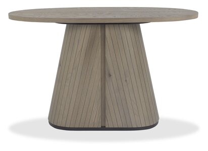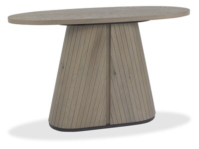 Blending rustic character with contemporary design, the Vega Grey Oiled Oak range adds warmth and sophistication to the dining experience. Elliptical dining table tops, surfaced with hardwearing sawcut oak and finished in a grey oil finish, feature sturdy pedestal bases with tapered silhouettes and v-groove detailing, offering both durability and visual appeal. The range extends to versatile pedestal based occasional pieces, including an oval lamp and coffee table. Additionally, further choice is offered with drum style occasional designs with discreet storage behind hinged doors. Cabinetry with soft curved ends sit on contrasting peppercorn bases with refined scalloped legs. Concealed drawers in the sideboards provide practical storage, while moulded ply-back chairs and barstools, upholstered in ivory bonded leather or fine-weave grey fabric, deliver comfort with modern elegance.