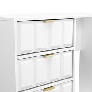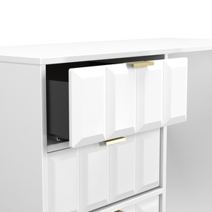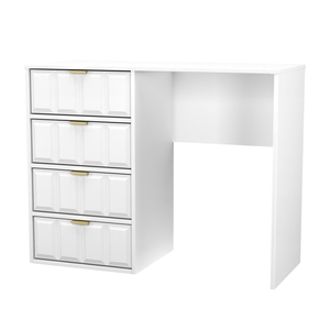 This 4 Drawer Vanity/Desk is equally at home in the bedroom or the office. A modern and distinctive range. Named for the unique "Cube" patten of the drawer and door fronts. Also features Gold Metal Handles and Gold Hairpin Legs. Comes in a wide range of colours including eye cathching two tone colour combinations. All our furniture is made in the United Kingdom, to the highest quality. It is delivered direct to your location of choice by one of our two man delivery teams, and comes fully assembled (although legs may be removed to prevent damage in transit).