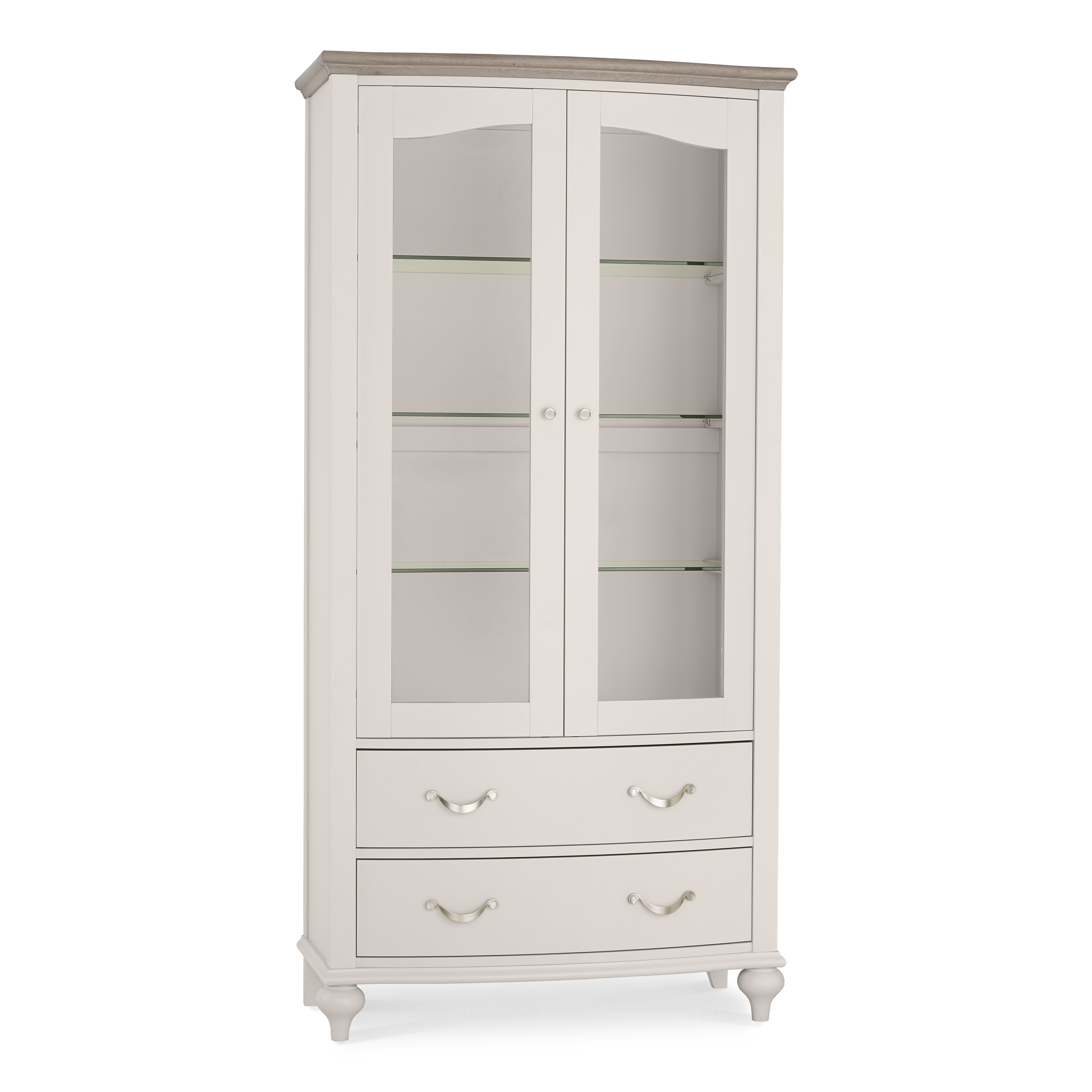 With drama and sophistication in abundance, Montreux boasts beautiful form by way of serpentine framed tops, gently bow-fronted cabinet & classically styled turned legs. Bespoke handles, intricate oak marquetry tops and large roll back upholstered chairs all add to the uncompromising design detail which together with the combination of striking grey washed oak tops contrasting with soft grey pigment frames will ensure this range makes a striking statement in any home. Quality touches such as soft closing drawers for the cabinet and reciprocal extension runners for the dining tables epitomise the best of contemporary styling and everyday use.