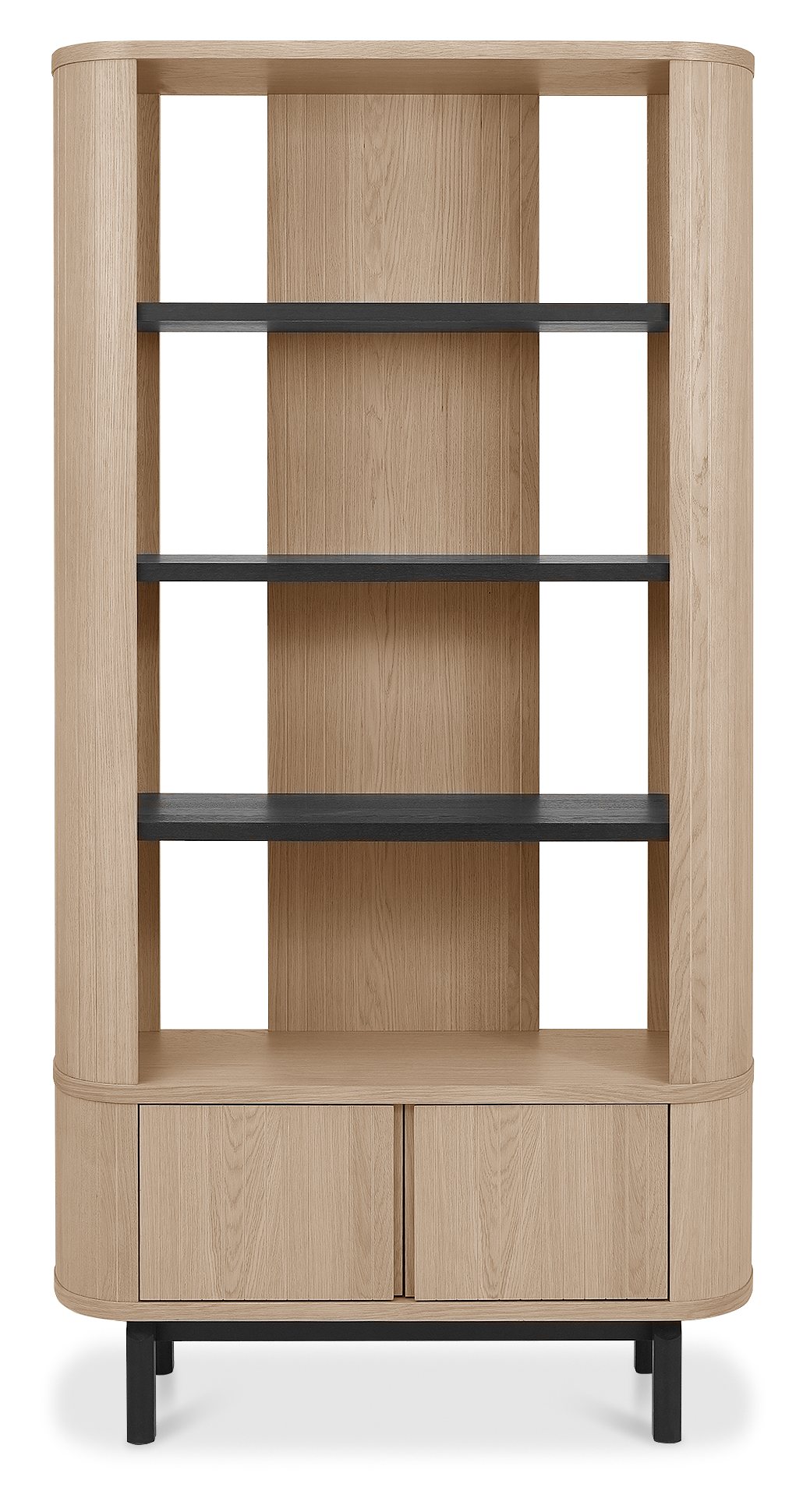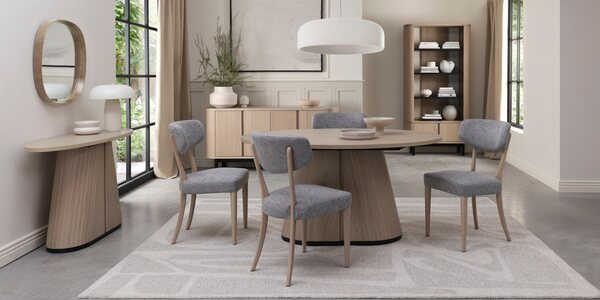 Balancing precision craftsmanship with a contemporary aesthetic, Vega Scandi Oak brings a refined yet inviting presence to the dining space. Elliptical dining tables showcase beautiful oak veneers, supported by tapered pedestal bases with v-groove detailing, offering both visual appeal and lasting durability. The range extends to versatile pedestal based occasional pieces, including an oval lamp and coffee table. Additionally, further choice is offered with drum style occasional designs with discreet storage behind hinged doors. Cabinetry with curved ends sit on contrasting peppercorn bases with refined scalloped legs. Concealed drawers in the sideboards provide practical storage, while moulded ply-back chairs and barstools, upholstered in ivory bonded leather or fine-weave grey fabric, deliver comfort with modern elegance.