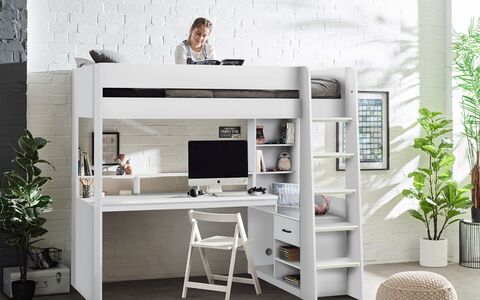 Step into the gaming sanctuary of your dreams with the Blaze Gaming Highsleeper – an exquisite fusion of style and functionality. This expertly crafted bunk bed, with a White finish, is beautifully designed to be the ultimate haven for every gamer. Its built-in shelving and drawers seamlessly provide organised storage for gaming gear and essentials within arm's reach. The wide-span desk offers abundant space for any gaming setup, while raised platforms effortlessly cradle monitors, offering an immersive gaming experience. Glow-in-the-dark steps guarantee a secure ascent to the elevated gaming realm.