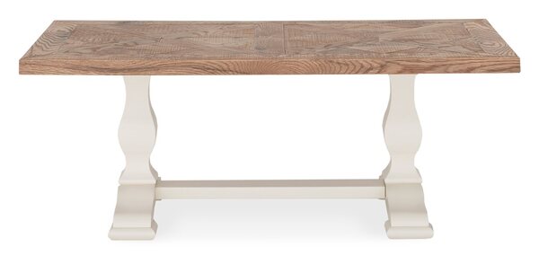 Belgrave is a classically styled design contrasting an ivory painted finish with beautifully hand-crafted marquetry tops using American white oak solid timbers and veneers. Each piece of furniture reflects the intensified natural characteristics of rustic oak wood such as knots, mineral streaks pinholes, sapwood, handplanning, saw marks and wood colour variation. These natural variations in colour, grain and random positioning of knots are inherent characteristics and add to the attraction of the wood, resulting in an individuality that is unmatched by regular furniture. The range is completed with bold bespoke handles in a rich antique brass finish and a choice of generous upholstered chairs in a choice of tan and espresso antique faux leathers. BLUM soft closing drawers add that extra refinement to what is a timeless classic.