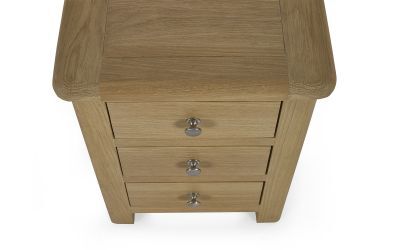 Meticulously crafted, the Memphis 3-drawer bedside is a charming blend of timeless elegance and contemporary design. Finished in exquisite limed oak with gracefully curved edging, it adds tasteful allure to any bedroom. Three spacious drawers offer ample storage, keeping your space organised. Customise with polished silver handles for a classic look or alternative cupped handles subtle style variation.