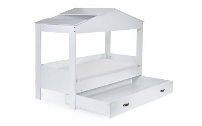 Step into the whimsical world of the Hazel Low Sleeper – a charming white hut house bed that sparks joy and imagination. The paneled roof and inviting gap for stargazing adventures turn bedtime into a magical experience for your little ones. With a large drawer underneath, storing treasures and bedtime essentials is a breeze, creating a clutter-free haven. Crafted with the safety of your children in mind, two trap handles make it easy for little hands to access their dreamy retreat. Transform your child's room into an enchanting space where bedtime stories come to life and dreams take flight.