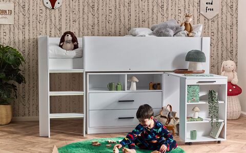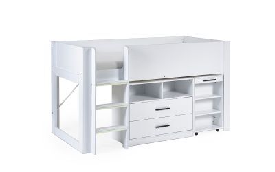 Embark on a bedtime adventure with the Otis Midsleeper a versatile and stylish addition to your child's room that transforms bedtime into an adventure. The crisp all-white finish sets a clean and modern tone. Featuring two pull-out drawers with handles for convenient storage and shelving underneath for toys and essentials. The highlight of this bed is the pull-out desk with wheels, offering a dedicated study space that can be easily tucked away when not in use. Additional shelving space ensures an organised and clutter-free environment for your little one. The three glow-in-the-dark steps add charm and safety, creating a playful and secure ascent to the cosy sleeping area.