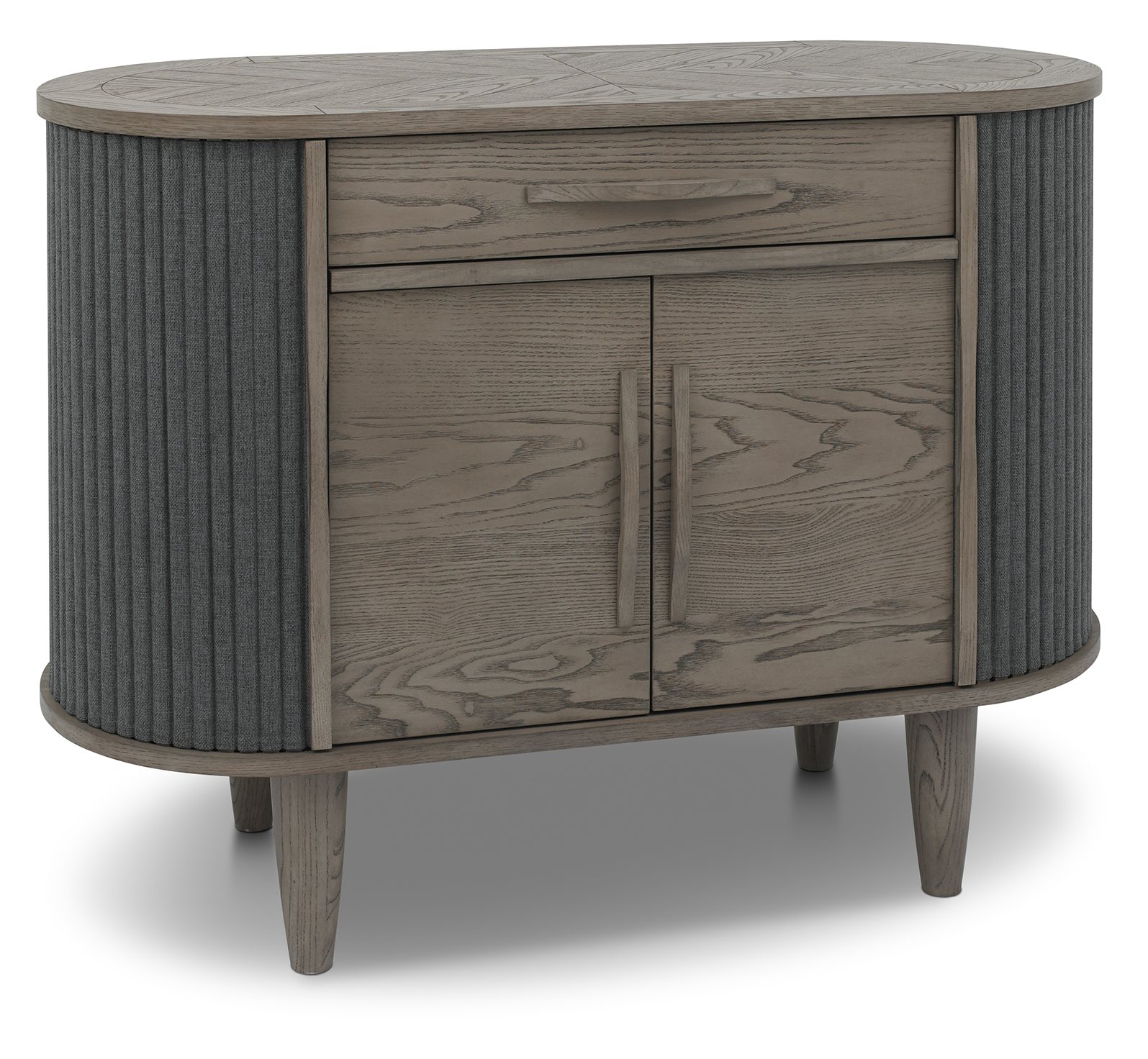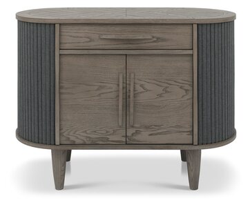 Monroe Silver Grey dining combines classic and contemporary styling to create timeless statement pieces for any home. Comprising of circular and lozenge-shaped forms, this range highlights on-trend, organic and flowing designs that provide a calming feel with softened edges and curves. This aesthetic is accentuated with saw-cut ash chevron pattern on the tables, cabinet tops and display unit which are finished in a fresh silver grey, and accompanied with matching turned tapering legs or contrasted with peppercorn powder coated metal frames. Slate grey fabric upholstered dining chairs and tambour doors complement this palette choice and add texture to pieces such as the sideboard and open display unit, whilst quality touches such as soft-closing runners speak to the craftsmanship and refinement of Monroe.