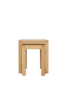 This Bosco nest of tables offers elegance and versatility. The set comprises two individual oak tables where the smaller table nests into the larger one to save space when not in use. This furniture features the signature Bosco curved finger joints on the top corners of both tables. It is finished in a clear matt lacquer to show off the beauty of the oak.