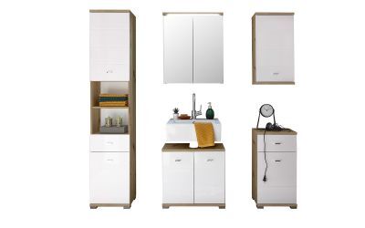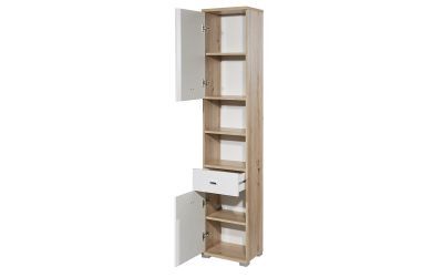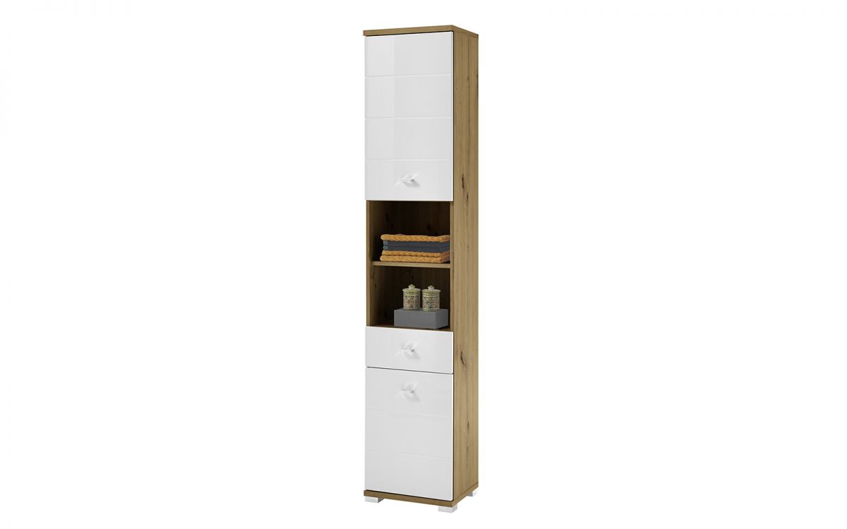 The Pool Cabinet offers a perfect mix of storage and display options for your bathroom. Made from Artisan Oak with a striking white high gloss front and a lined notch design, it brings a modern, sophisticated touch to any space. With two cupboards and four shelves, it provides ample room for storing all your essentials. The two open middle compartments create a beautiful space to showcase decorative items or neatly folded towels, while the pull-out drawer adds extra functionality. Finished with sleek silver handles, this cabinet combines beauty and practicality, making it ideal for any bathroom.