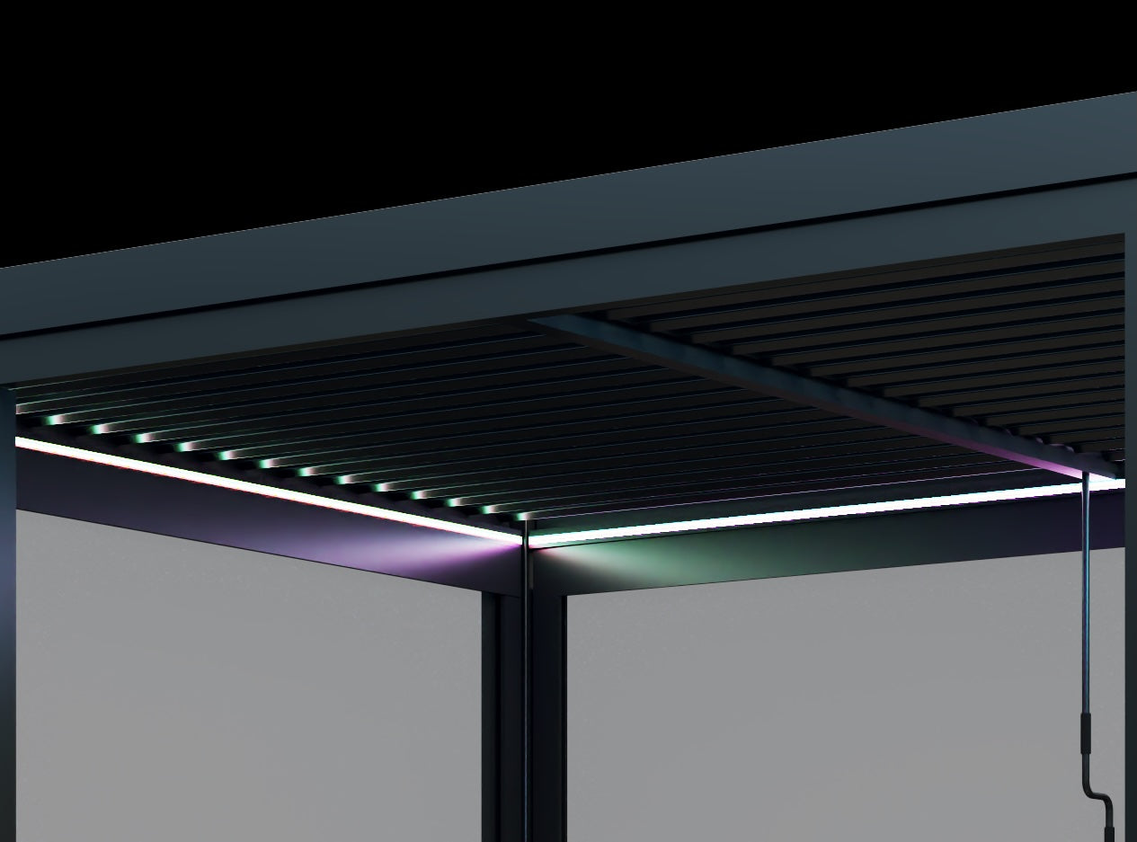 Unlike standard pergolas on the market, Saturn features a double-layered tilting louvre roof system and a uniquely reinforced structural design that increases overall rigidity and wind resistance.