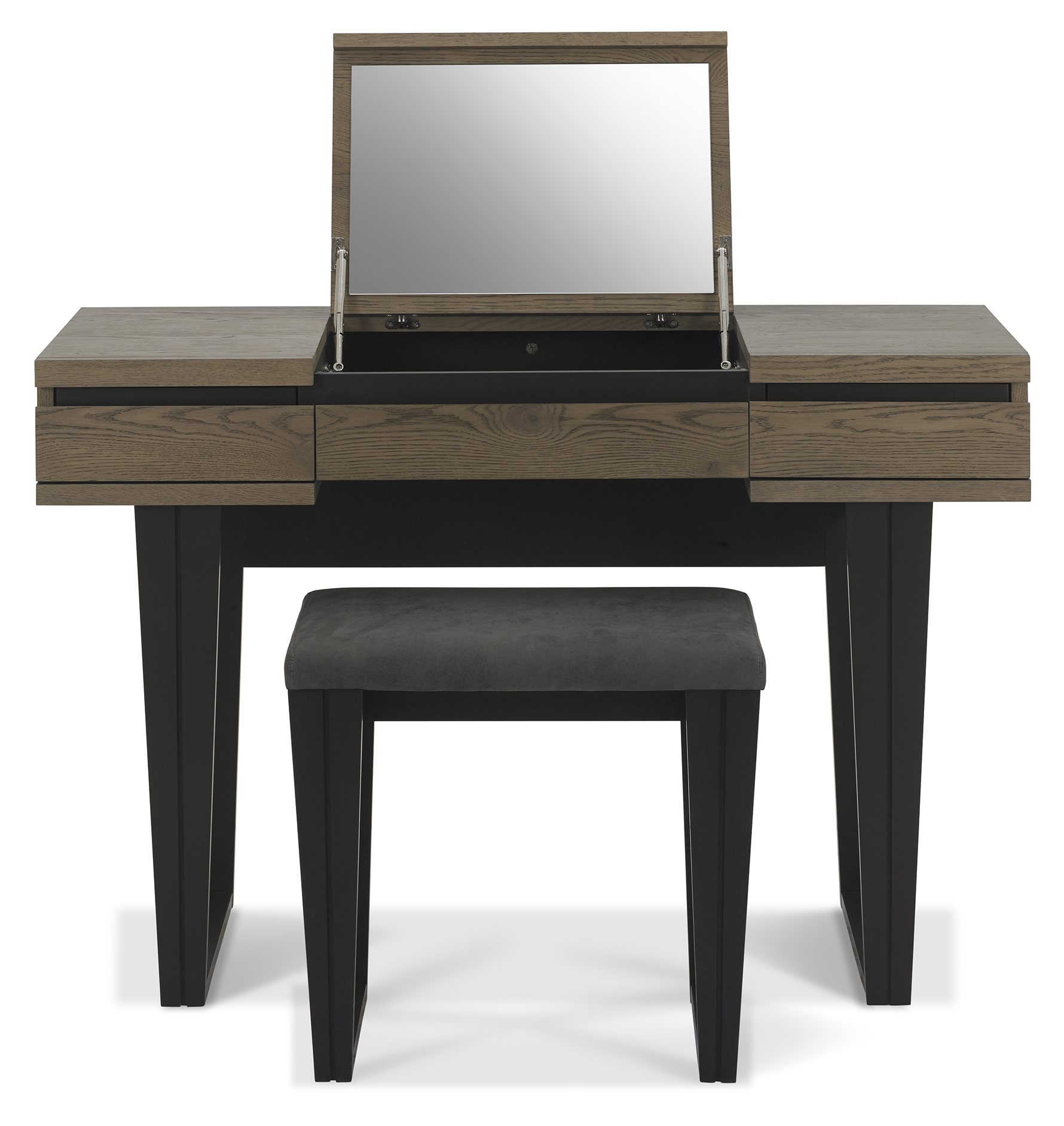 Tivoli is a contemporary and on-trend bedroom range incorporating a bold and striking mix of wire brushed rustic weathered oak with ebonised accent detailing and legs. Design features include staggered planking effect on the headboard & cabinet facia and unique tapering legs with fluting detail. Practical touches such as BLUM soft close drawer runners and a hide-away dressing table mirror makes Tivoli a compelling choice for the modern bedroom.