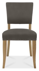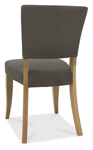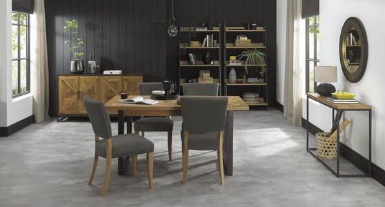 Indus is a striking design combining saw cut oak marquetry tops with a ''peppercorn'' finished wire brushed oak veneered frame and a welded black powder coated metal base, giving it an on trend industrial edge. Each of the hand-crafted pattern tops are wire brushed and distressed to give a rustic look and tactile feel, making the most of the beautiful and varied grain of oak. Choose from generously proportioned oak upholstered chairs in four velvet options or a mottled grey fabric or cantilever chairs that feature this same fabric in a bold square pattern stitch detail with a handle in the back and superior glides on the base for ease of manoeuvre. BLUM soft closing hidden drawers within the sideboard cabinets add that extra refinement to the range in what will create a stunning focal point in any dining room.
