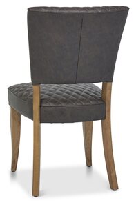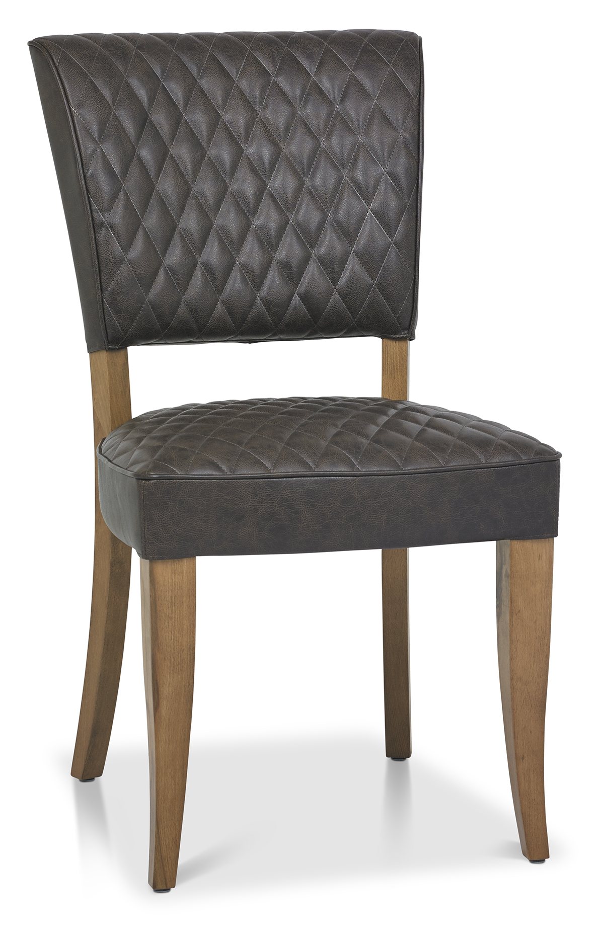 Generously proportioned dining chairs, styled with diamond stitch upholstery in a choice of luxurious dark grey fabric and old west vintage bonded leather, feature plush padded seats, gently flared backs and elegantly tapering legs, imbuing comfort and indulgence.