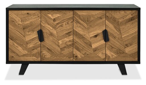 With a modernised retro look, Emerson features striking patterns of saw cut rustic oak tops & facias that are showcased against wire brushed peppercorn finished frames and a welded black powder coated metal base. Each of the hand-crafted pattern tops are wire brushed and distressed to give a rustic look and tactile feel, making the most of the beautiful and varied grain. Soft form barrel shaped table tops and moulded curved seats and back on the chairs pair contemporary craftmanship with utmost comfort, with the choice of rich velvets and mottled aged fabrics making a statement in any home. Shaped metal handles that mirror the geometric oak patterns and hidden soft close drawers in the sideboards complete this luxuriously sophisticated and dynamic range.