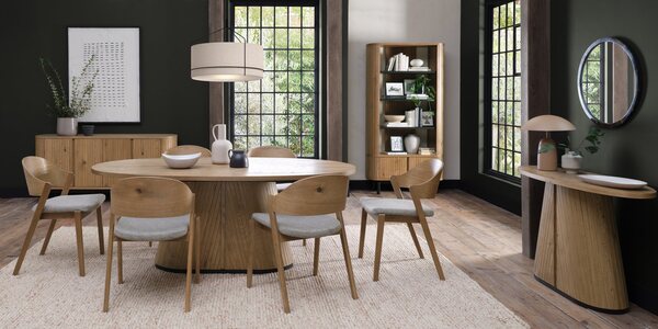 Blending rustic character with contemporary design, the Vega Rustic Oak range adds warmth and personality to the dining experience. Elliptical dining table tops, surfaced with hardwearing sawcut oak and finished in a nourishing oil finish, feature sturdy pedestal bases with tapered silhouettes and v-groove detailing, offering both durability and visual appeal. The range extends to versatile pedestal based occasional pieces, including an oval lamp and coffee table. Additionally, further choice is offered with drum style occasional designs with discreet storage behind hinged doors. Cabinetry with soft curved ends sit on contrasting peppercorn bases with refined scalloped legs. Concealed drawers in the sideboards provide practical storage, while moulded ply-back chairs and barstools, upholstered in ivory bonded leather or fine-weave grey fabric, deliver comfort with modern elegance.